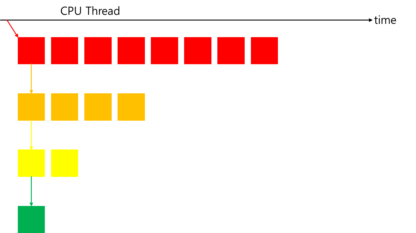 다음 그림은 Dynamic Parallelism를 사용하여 어떤 커널에 의해 구성된 nested recursive execution이다. host application은 single thread block에서 8개의 threads를 사용하여 parent grid를 호출한다. 그 다음, 해당 grid의 thread 0이 child grid를 호출하며, 이 child grid는 절반의 threads를 가진다. 그리고나서, 첫 번째 child grid의 thread 0이 다시 절반의 threads를 가지는 새로운 child grid를 호출한다. 이 과정은 하나의 thread만 남을 때까지 지속된다.