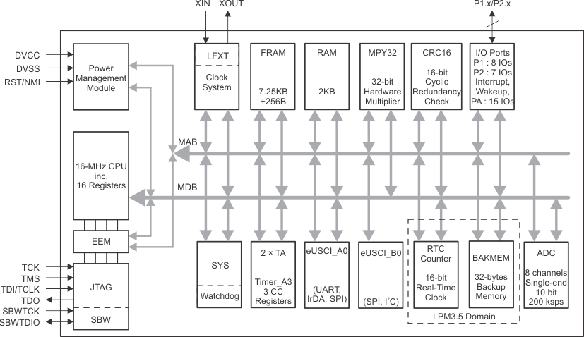 예를 들어, MSP430FR2422 Microcontroller의 Block Diagram을 보면, 이 Microcontroller에는 Flash 대신 FRAM을 사용한 것을 알 수 있으며, 그 크기는 8KB이다. 이 Microcontroller는 초저전력 애플리케이션을 공략하는 것임을 시사한다.