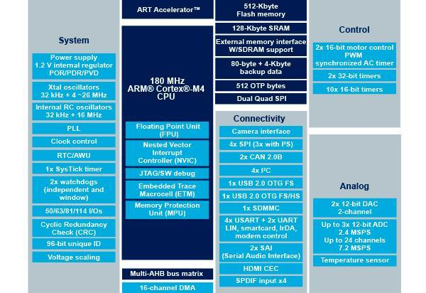 최대 속도는 180MHz로, 임베디드 애플리케이션에서는 매우 빠르다. 그리고 ST는 CPU 주위에 다양한 주변 장치를 추가했다.