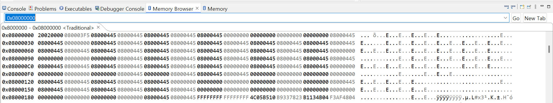 ST는 이 메모리에 boot loader 코드를 미리 넣어놓았다. 테이블을 참고했을 때, 0x0800_0000부터 0x0807_FFFF까지 프로그램 명령어를 저장할 수 있다. 코드를 다운로드하면, 0x0800_0000부터 코드가 쌓이기 시작한다.