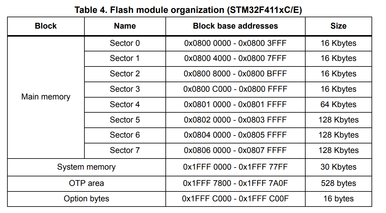 위 그림을 통해, 임베디드 비휘발성 메모리 구성을 알 수 있다. 총 512KB 용량의 Flash 메모리이다. 그 외에 System Memory라고 부르는 ROM이 있다. 사용자는 이 ROM에 쓸 수 없다.