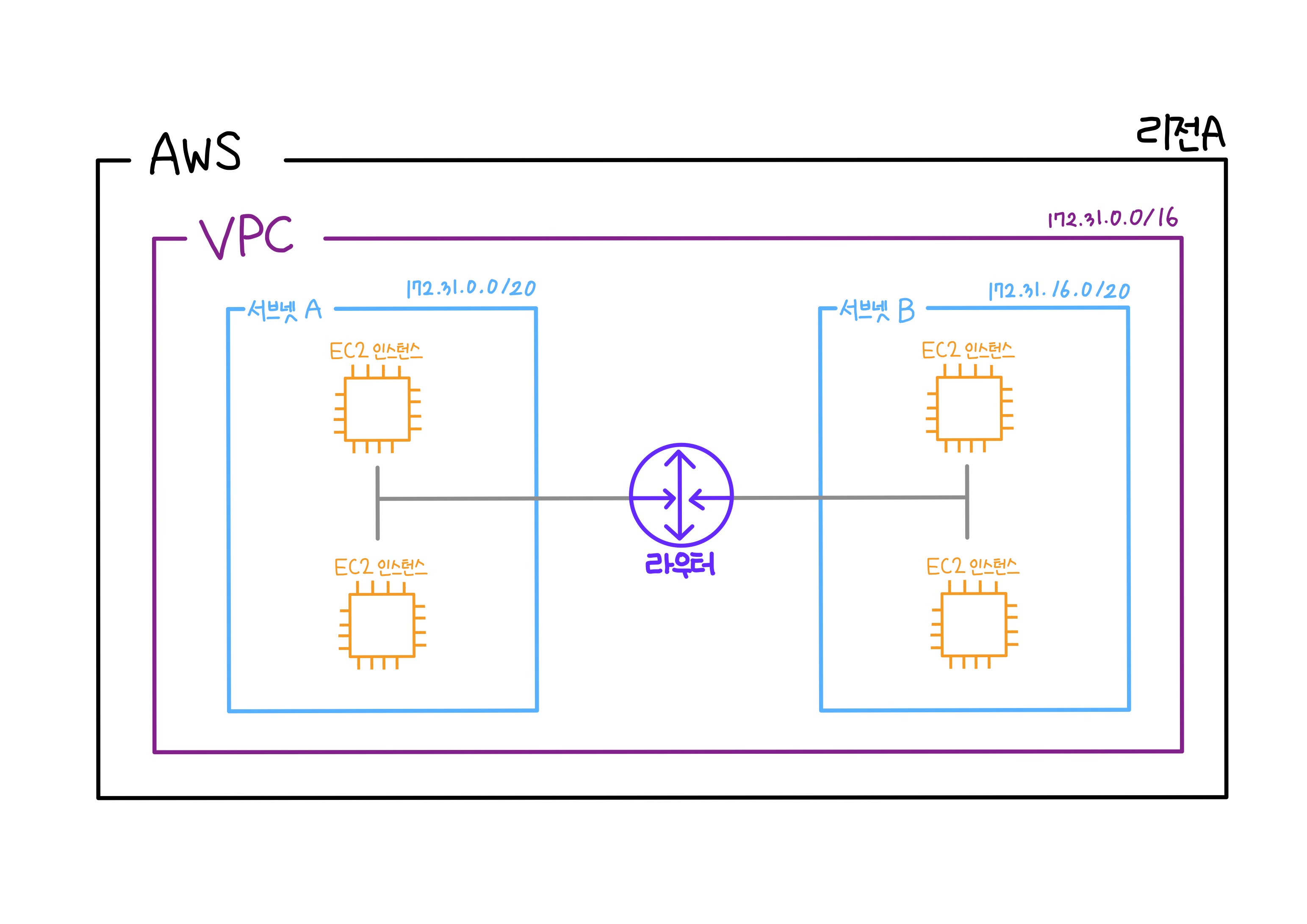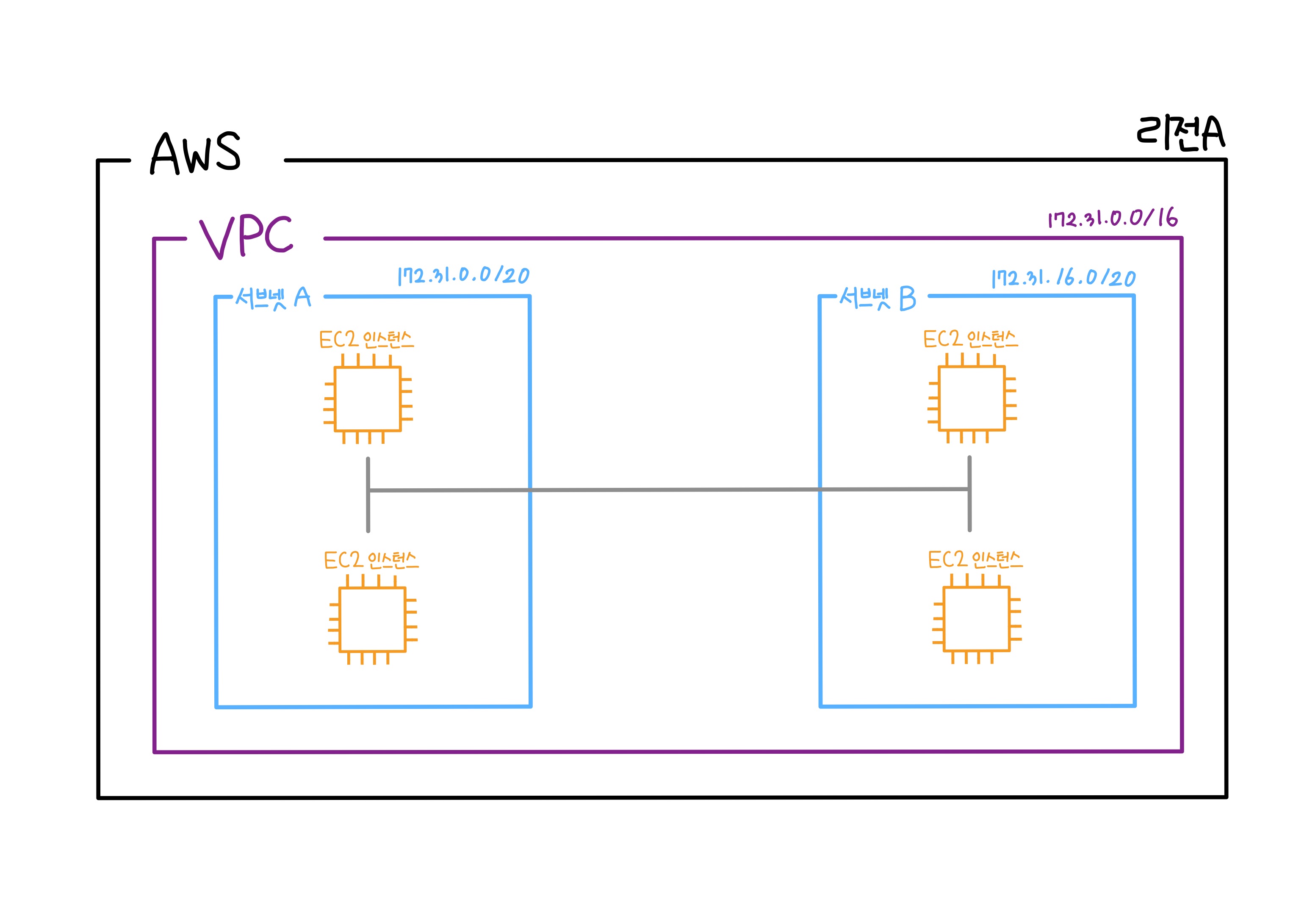 VPC가 없다면 EC2 인스턴스들이 거미줄 처럼 연결되고 인터넷과 연결됩니다. (정리가 하나도 안되어 보이죵?)