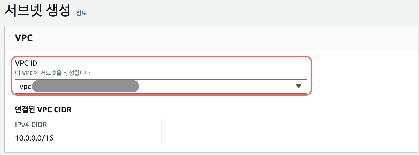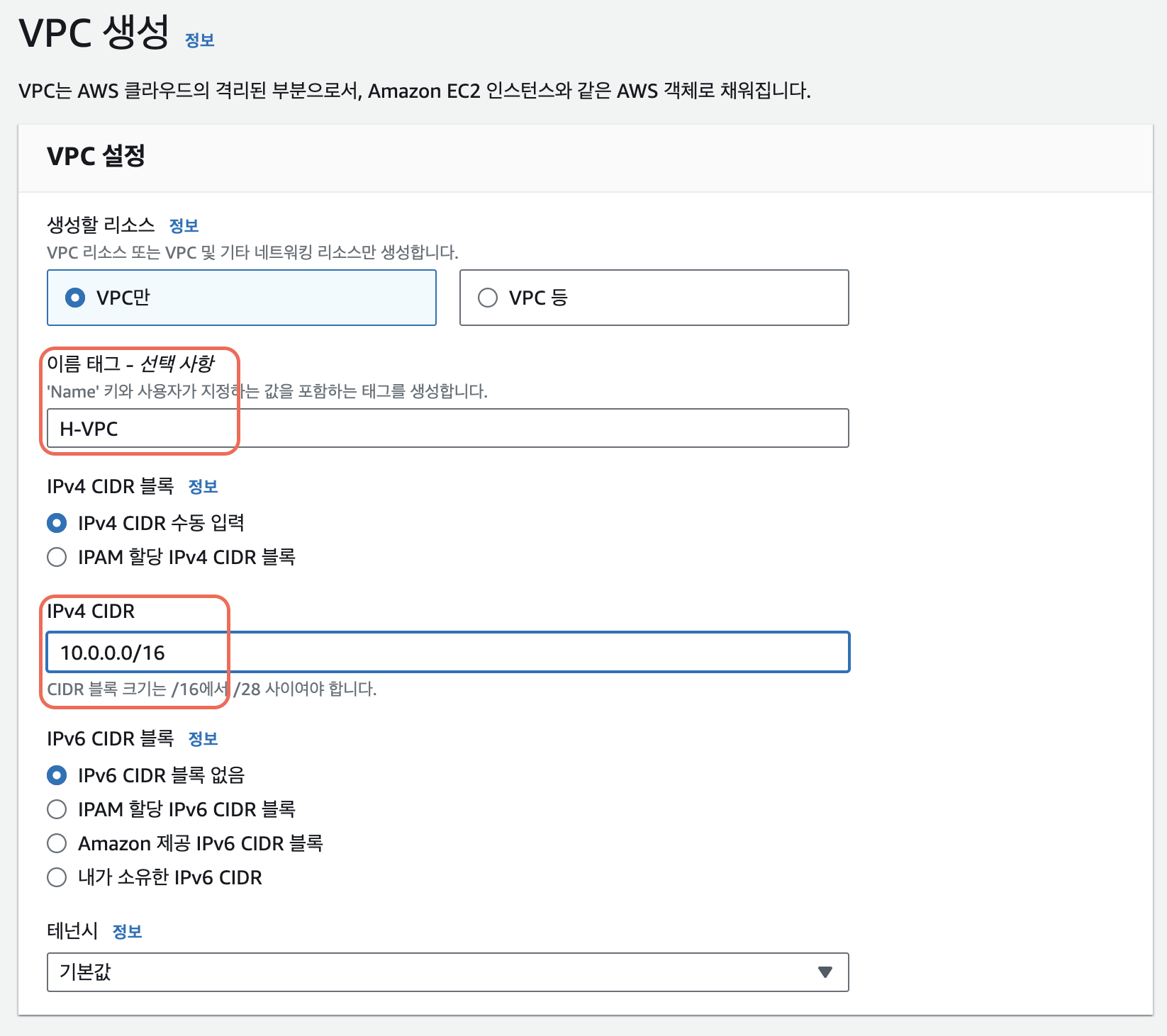 아래 이미지와 같은 설정으로 VPC를 생성해줍니다.