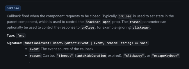 Snackbar에 onClose 속성이 required인지 몰라서 헤맸고, 함수명으로 적어야되는지 몰라서 이후에도 좀 더 시간이 걸렸다.