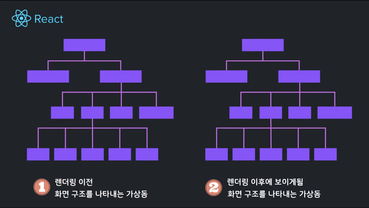 (만약 list안에 10개의 항목이 바뀌었다면 실제돔을 10번 반복해서 조작하는 것이 아니라, 한꺼번에 바뀐 모든 부분들을 집단으로 조작시켜준다. 돔조작에 있어서 가장 비용이 많이 드는 부분은 화면을 그려주는 작업.