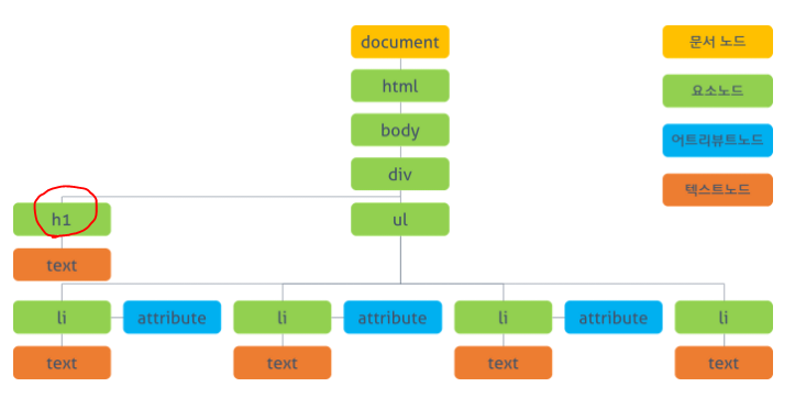 여기서 h1이라는 태그의 텍스트 색상을 빨간색으로 바꾸고자 한다면 우리는 document.getElementById('h1의 id')라는 DOM 접근 메서드를 이용할 것이다.