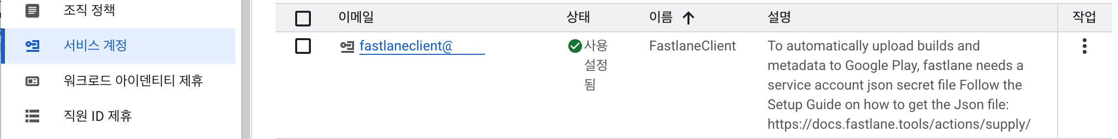 : IAM 및 관리자 > 서비스 계정 > FastlaneClient