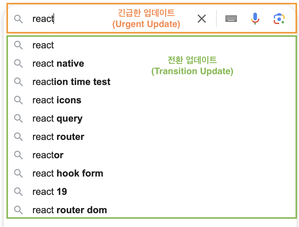 React 18에서 도입된 API 중 startTransition, useTransition, useDeferredValue 가 동시성 렌더링을 위해 추가된 기능들 입니다. (React19 현재 최신버전에도 도입되어 있음)