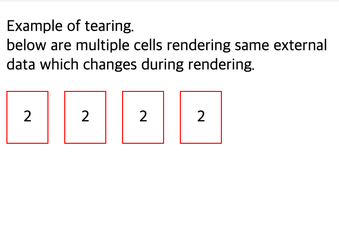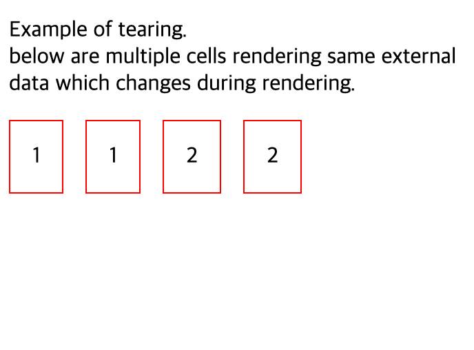 Tearing은 시각적(UI) 불일치를 나타냅니다. UI가 동일한 상태에 대해 여러 형태를 나타냄을 의미합니다.