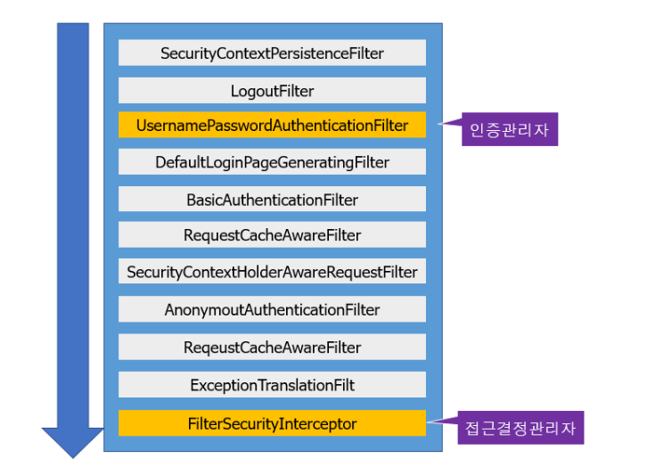 스프링 시큐리티에서는 필터(Filter)와, 필터로 이루어진 필터 체인의 흐름에 따라 인증과 인가를 처리합니다.