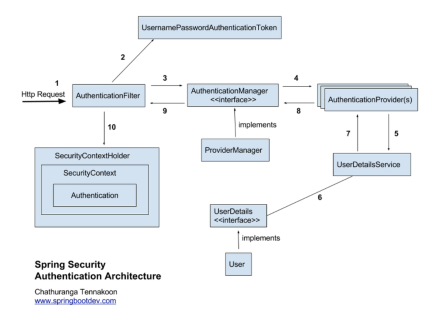 AuthenticationFilter가 정보를 인터셉트하여 UsernamePasswordAuthentication Token(Authentication 객체) 생성하여 AuthenticationManager에게 Authentication 객체를 전달.AuthenticationManager 인터페이스를 거쳐 AutheticationProvider에게 (2)의 정보 전달(Authentication 형태), 등록된 AuthenticationProvider를 조회하여 인증 요구AuthenticationProvider는 UserDetailsService를 통해 입력받은 (3)의 사용자 정보를 DB에서 조회supports() 메소드를 통해 실행 가능한지 체크authenticate() 메소드를 통해 DB에 저장된 이용자의 정보와 입력한 로그인 정보 비교UserDetailsService 의 loadUserByUsername() 메소드를 통해 불러옴Authentication 객체(UsernameAuthentication Token)Authentication 반환AuthenticationManger는 Authentication 객체를 AuthenticationFilter로 전달AuthenticationFilter는 전달받은 Authentication 객체를 LoginSuccessHandler로 전송하고 SecurityContextHolder에 담음AuthenticationSuccessHandle, 실패기 AuthenticationFailureHandle 실행