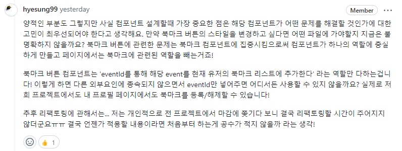 위는 실제 우리 팀원에게 남긴 코드리뷰다. 상대방이 나의 요구를 납들할 수 있게 나름의 근거를 제시하고 의도를 100% 드러냈다. 그리고 상대방 입장에서 기분나쁘지 않게 보일 수 있도록 계속해서 단어를 교체했다. 물론 이건 꽤 에너지가 드는 일이다. 하지만 결국 나에게 도움이 되는 일이라고 생각한다.