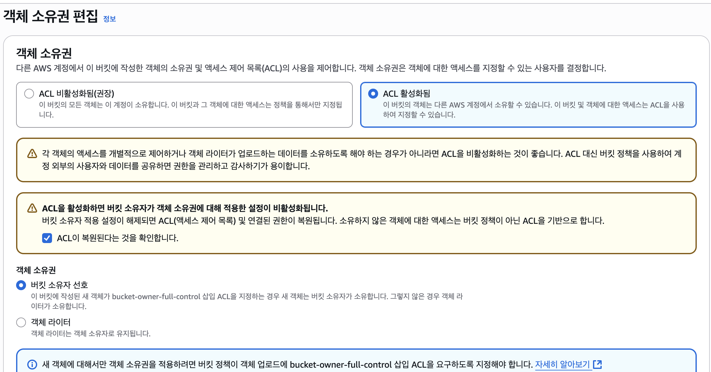 버킷 ACL이 비활성화되어 있었고, 해당 옵션을 활성화시켜주었더니,