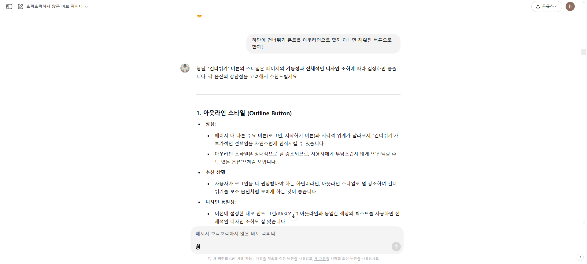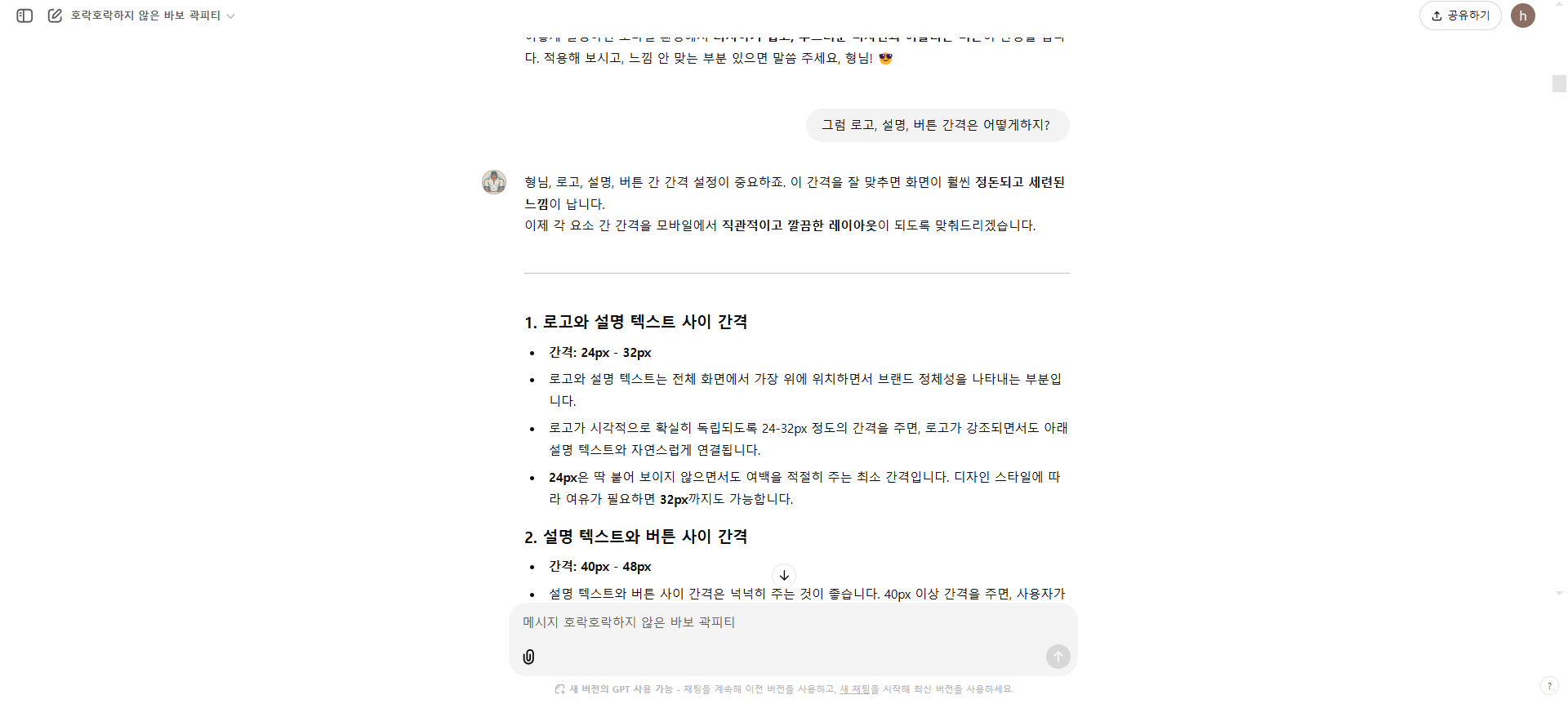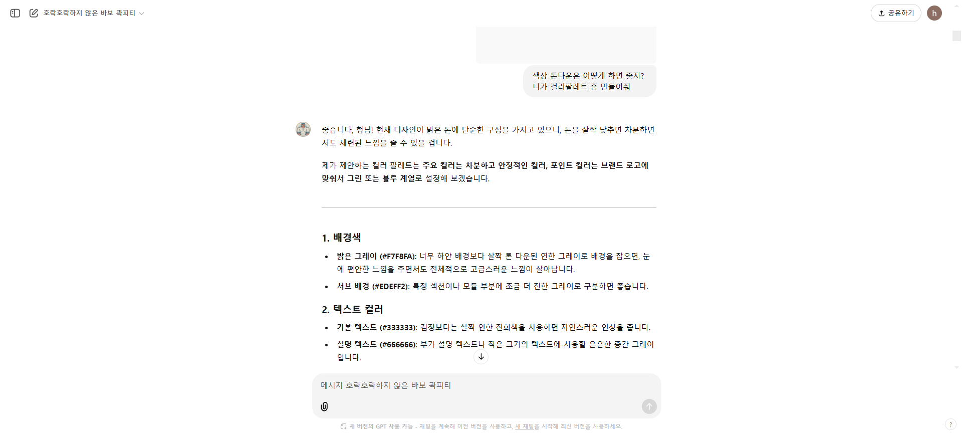 저는 이렇게 챗 gpt 와 대화하며 디자인 수정을 마무리했습니다!