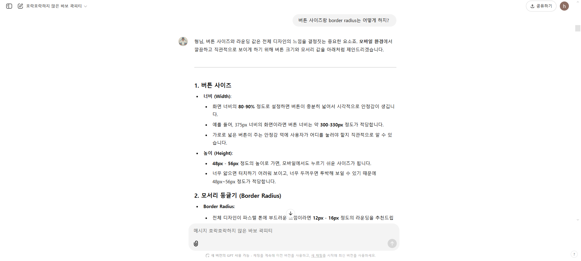 gpt에게 버튼 디자인할 때 어떤걸 더 고려하면 좋을까? 하고 물어본다면 좀 더 섬세한 디자인을 할 수 있을거예요.