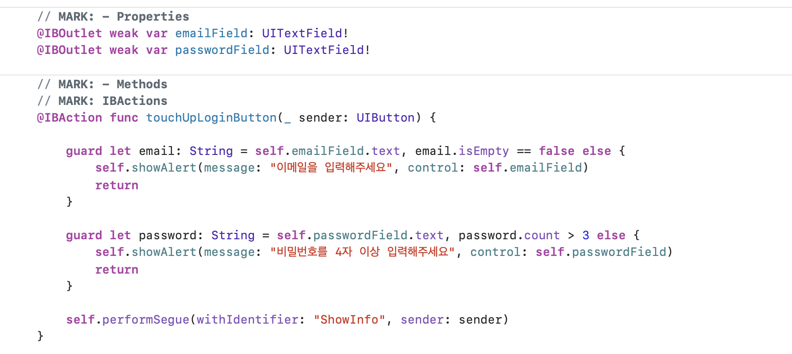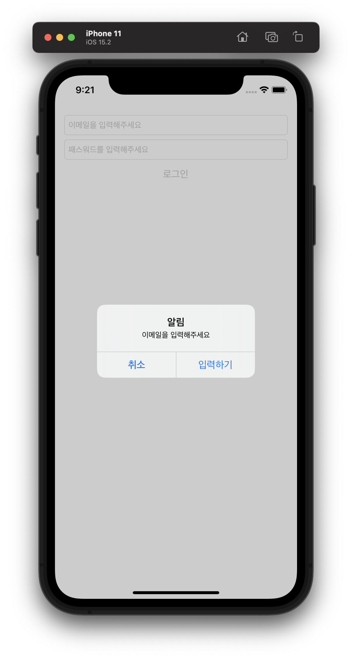 [입력하기] 버튼을 누르면 이메일 혹은 비밀번호 TextField에 커서가 띄워지도록 이렇게 만들어줄 수도 있다. UIAlertAction의 마지막 매개변수인 handler 클로저에는 사용자가 이 action을 선택했을 때 실행할 코드 묶음이 들어간다.