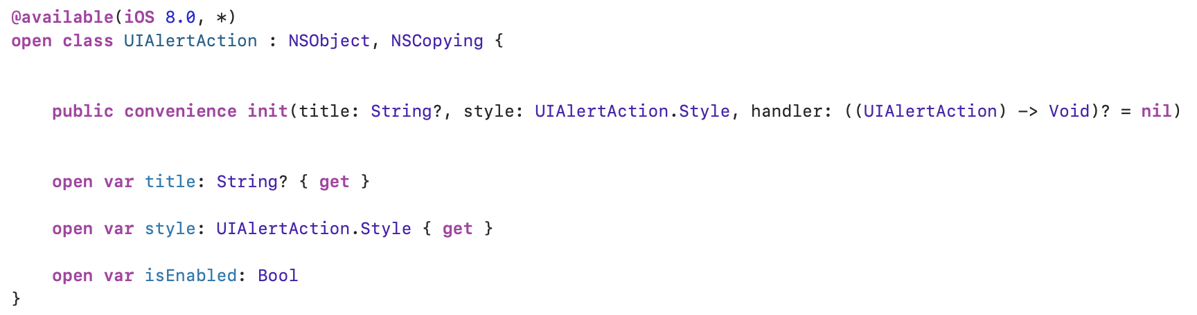UIAlertAction의 정의부로 이동해서 확인해보면 handler의 정의가 우리가 추측한 것이 맞다는 것을 알 수 있다.