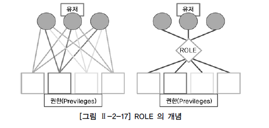 위 그림은 권한을 직접 유저에게 할당하는 것이며, 오른쪽 그림은 Role에 권한을 부여한 후 Role을 유저에게 부여하는 것을 나타낸다.