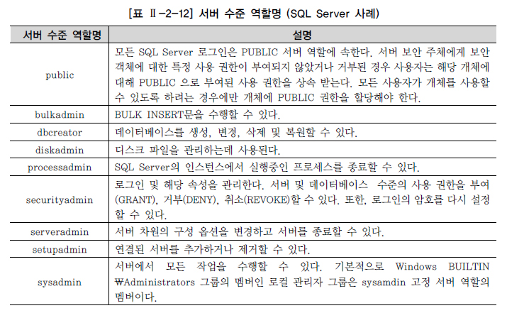 SQL Server에서는 서버 수준 역할을 통해 인스턴스 수준의 작업 권한을, 데이터베이스 수준 역할을 통해 데이터베이스 내의 권한을 관리한다.