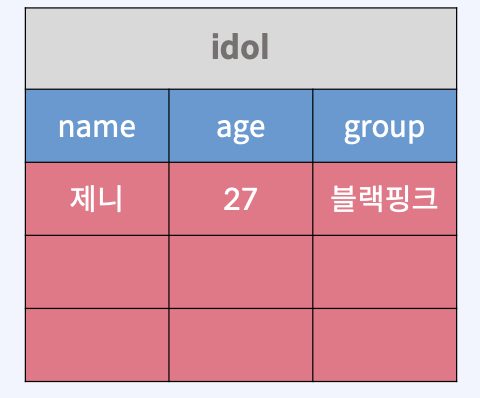 INSERT INTO idol (name, age, group) VALUES (“제니”, 27, “블랙핑크”);
