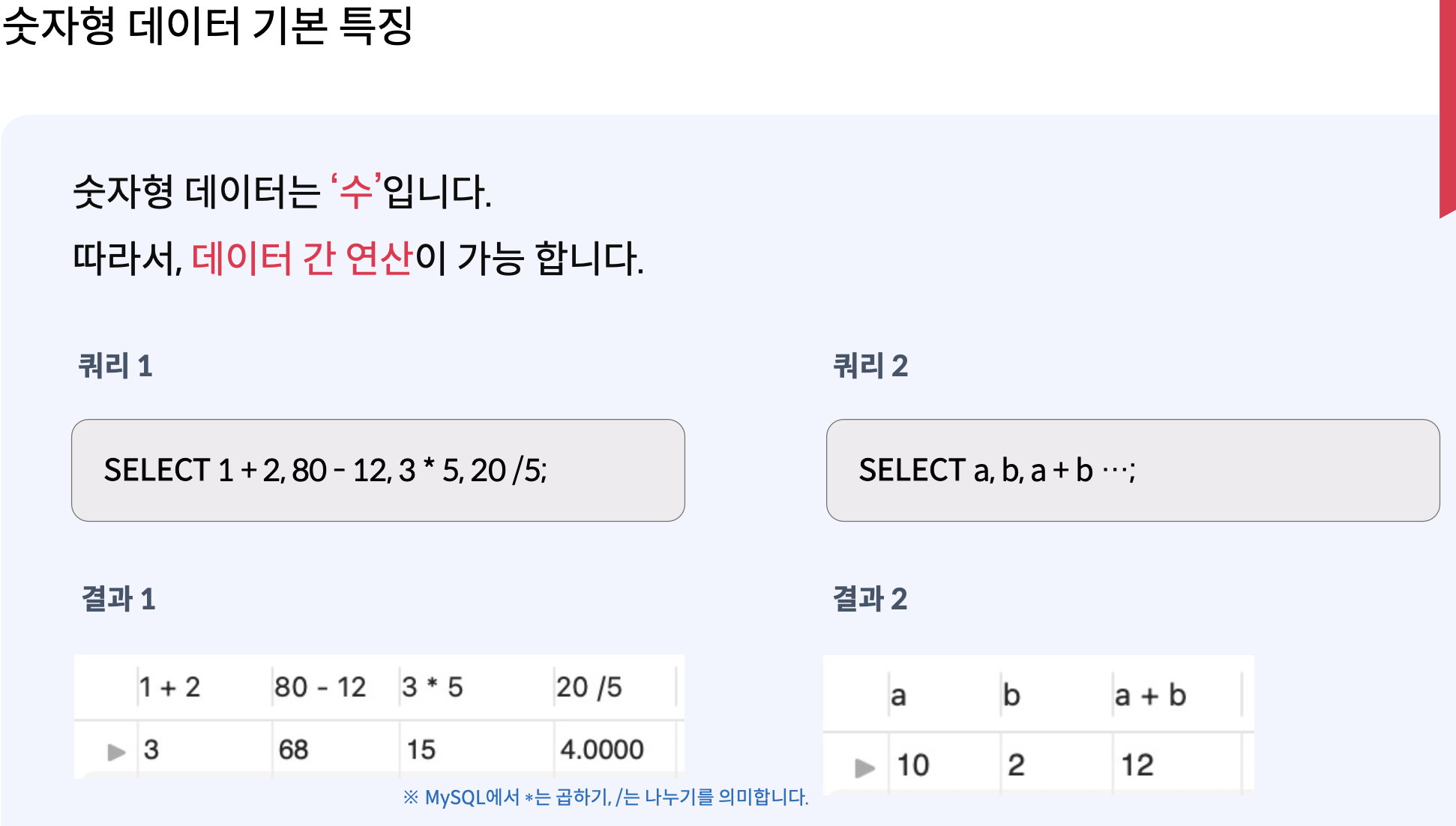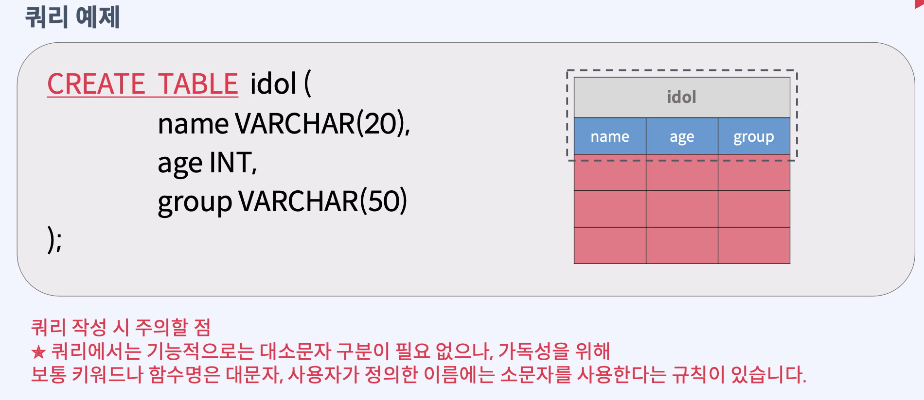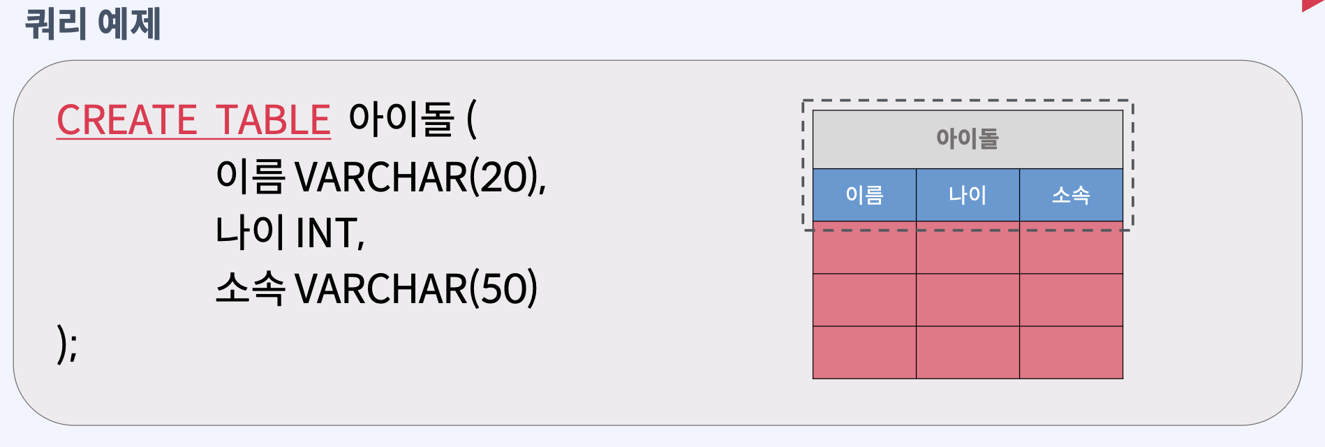 // 쿼리가 끝날 때는 항상 '명령을 마친다.'는 의미의 ; (세미콜론)을 꼭 붙혀야 한다.