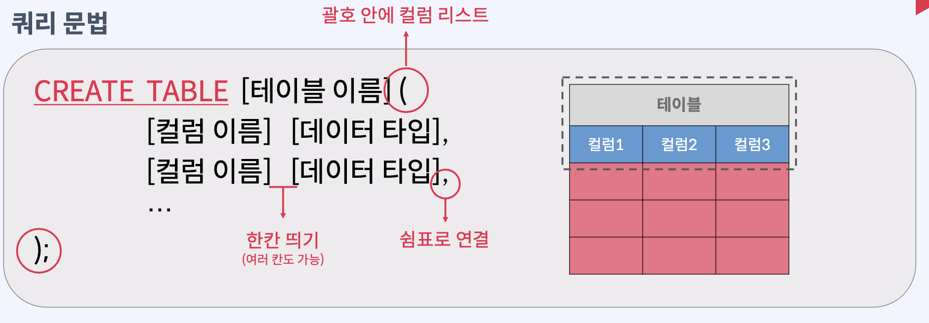 CREATE TABLE [테이블 이름] (