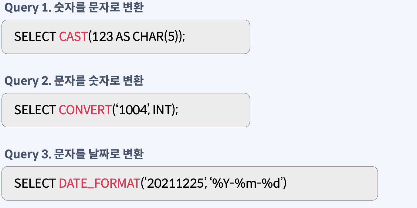 숫자형, 문자형, 날짜형 데이터는 함수를 사용하여 서로 타입 변환이 가능하다.