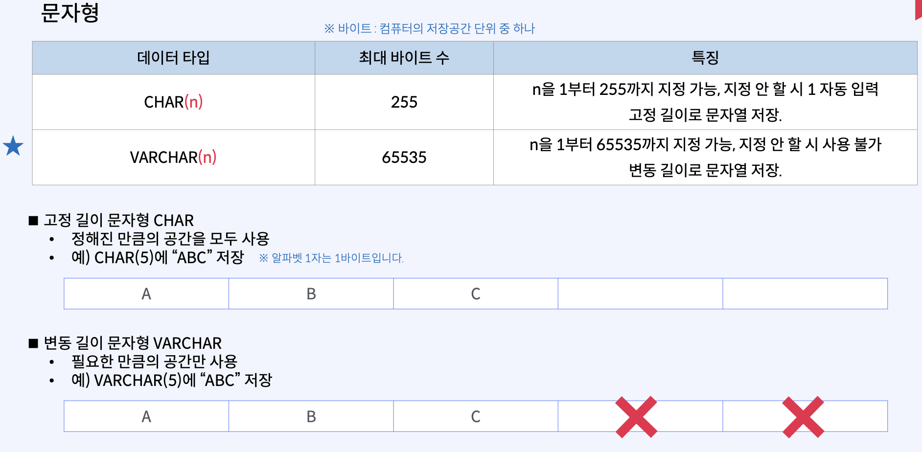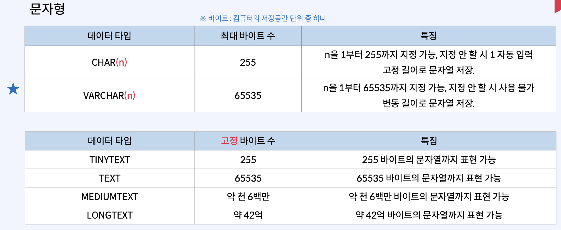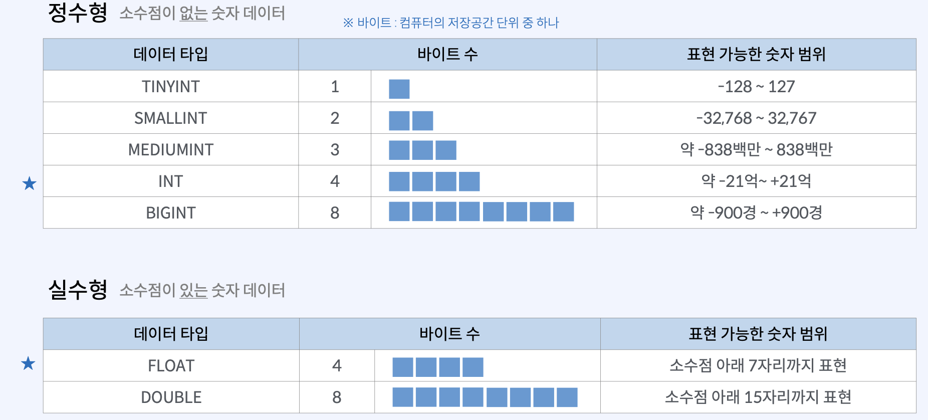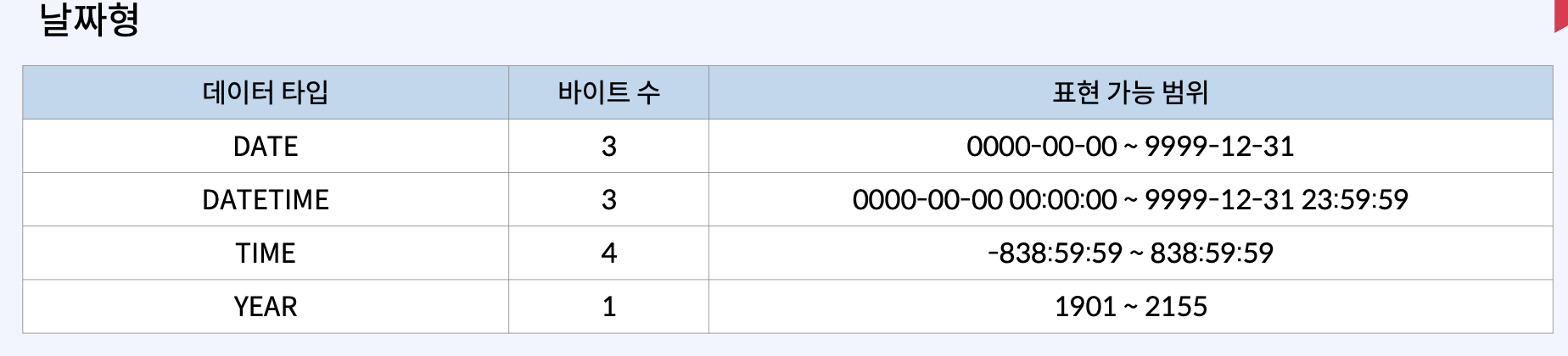 MySQL에서 사용할 수 있는 주요 데이터 타입은 다음과 같다.