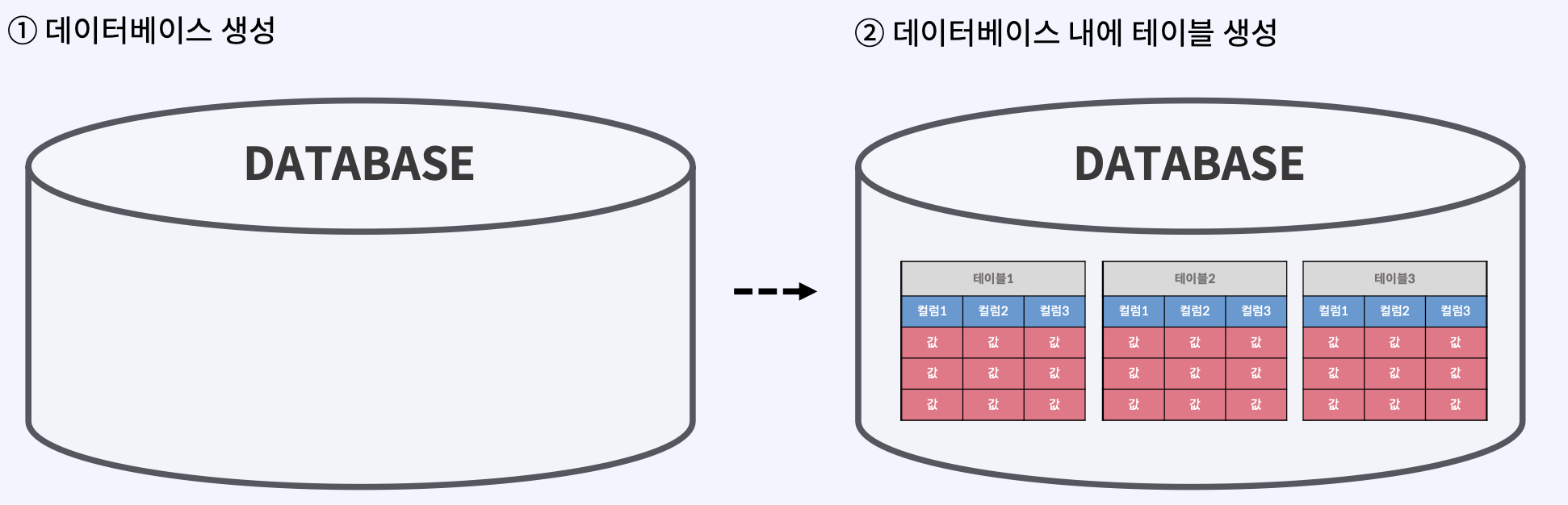 데이터베이스는 데이터베이스를 먼저 만든 후에, 특정 데이터베이스 내에 테이블을 생성하는 형식으로 만들어진다.