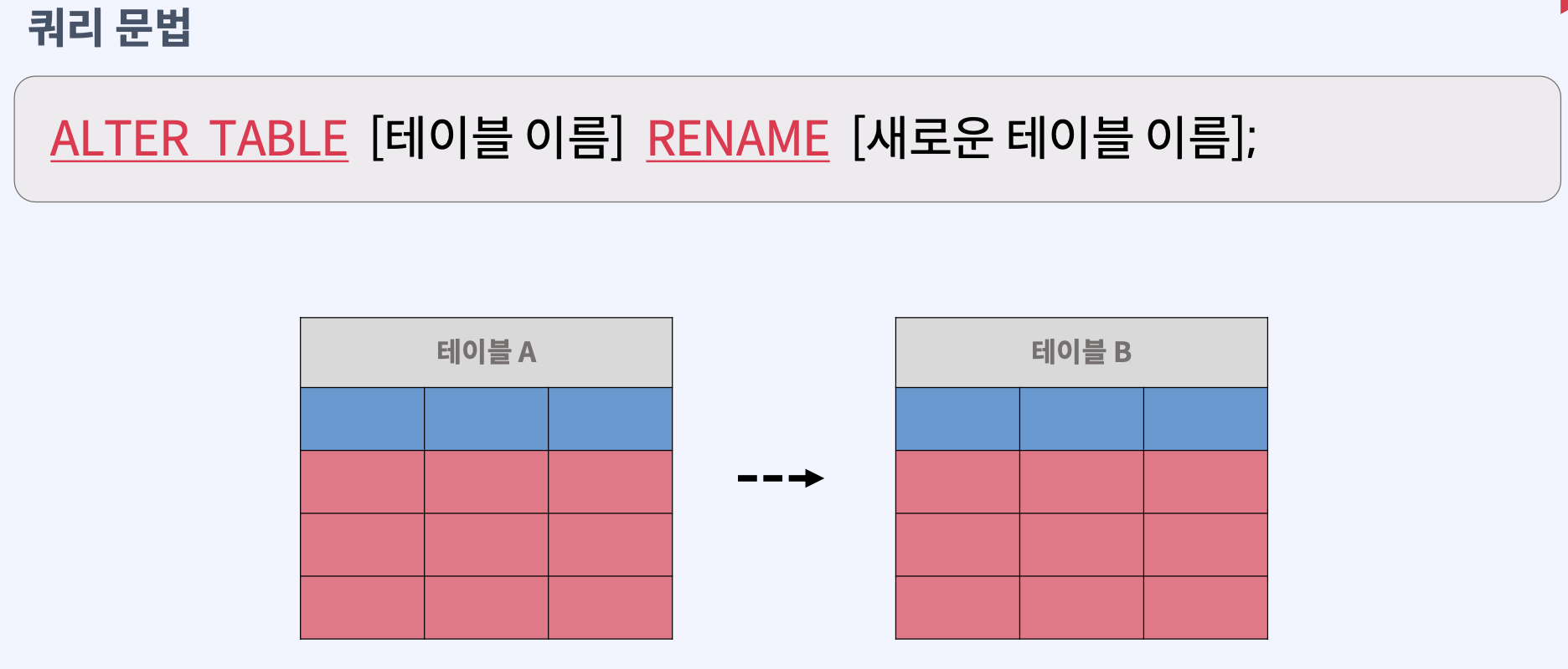 CHANGE COLUMN [컬럼 이름] [새로운 컬럼 이름] [새로운 데이터 타입];