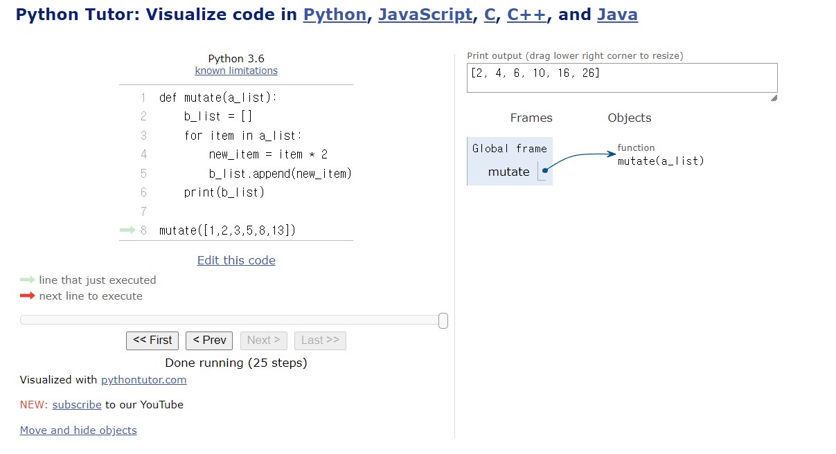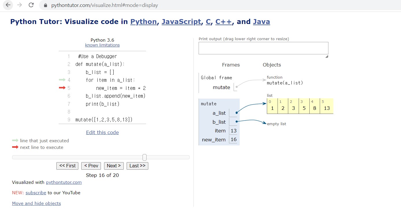 위에 코드를 실행하면, [2, 4, 6, 10, 13, 26]이 출력되어야 하지만, 실제로는 26밖에 출력되지 않는다. 디버거를 사용하여 한 줄 한 줄 단계별로 실행하여 어떤 것이 잘못되었는지 살펴본다.