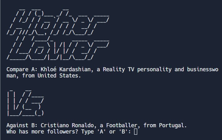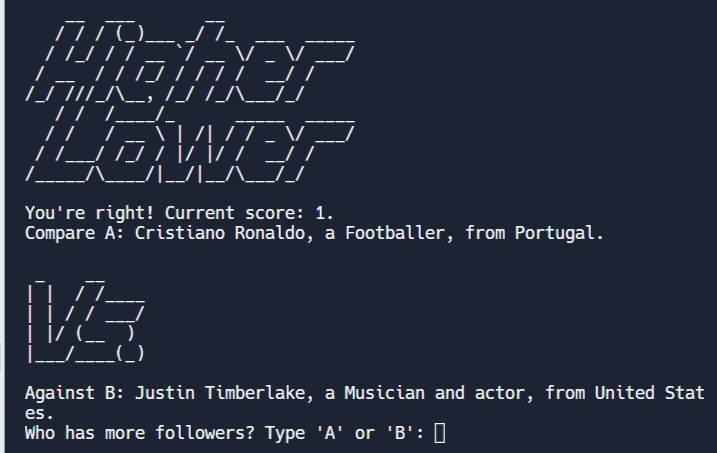 guess = input("Who has more followers? Type 'A' or 'B': ").lower()