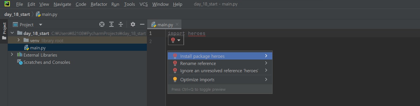 빨간색 전구를 누르면, 패키지를 설치할 수 있다.