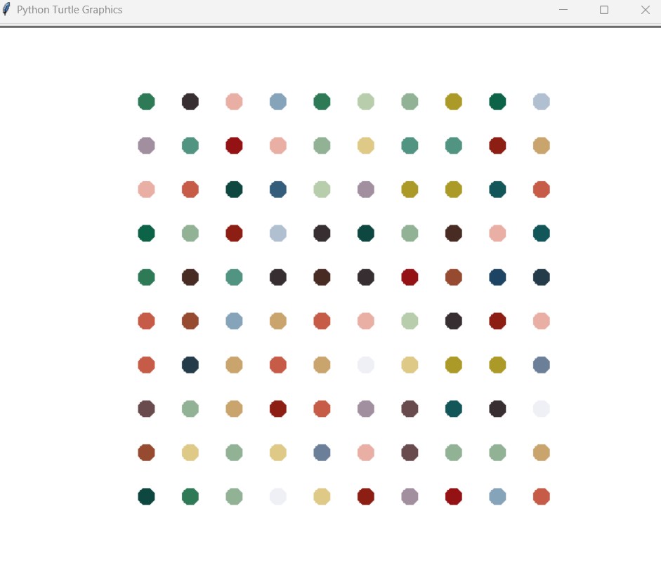 tim.dot(20, random.choice(color_list)) # 20 크기 만큼의 점을 찍는다.