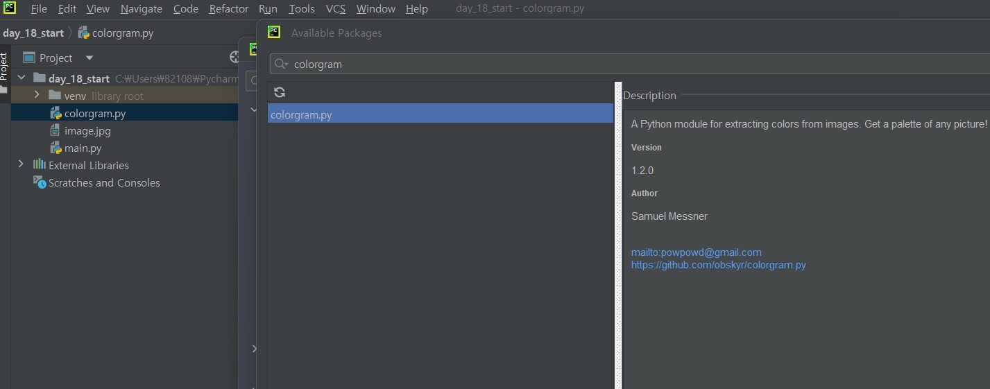 [ctrl] + [alt] + [s] 를 한 후, colorgram 패키지를 설치한다.