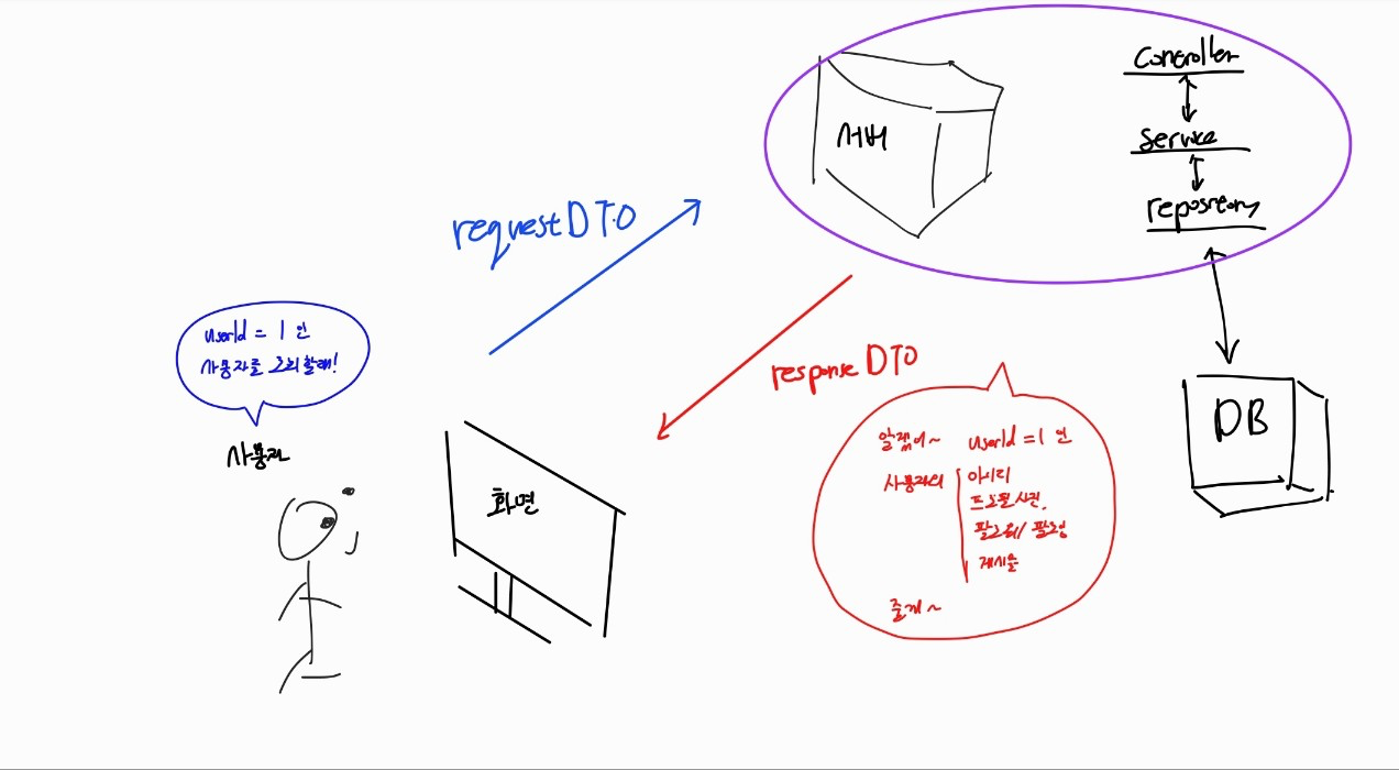 여기서 사용자는 화면을 보고있고, 화면(view)는 Controller -> Service -> Repository -> DataBase