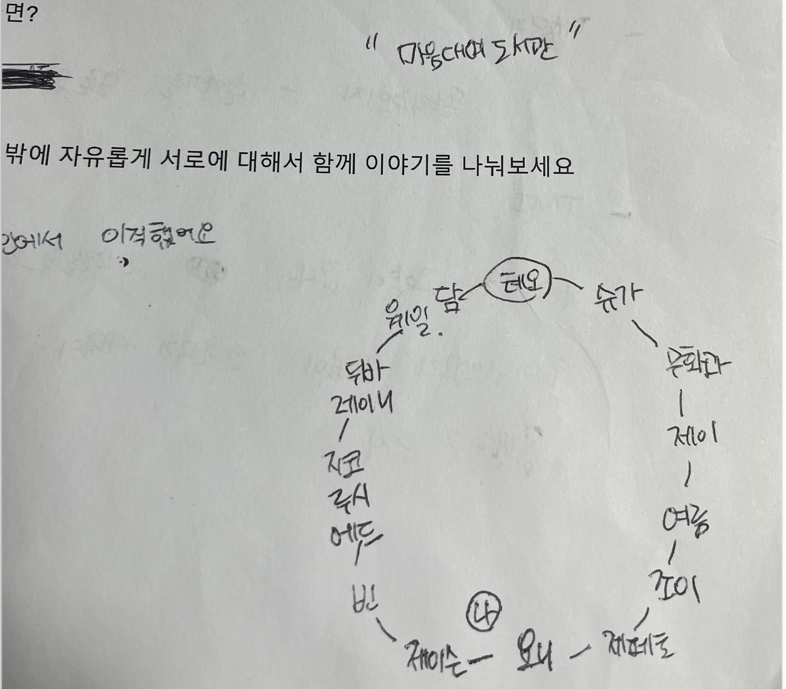 다음에 만나면 얼굴은 기억 못 해도 이름을 기억하고 싶어서 이름과 앉은 위치를 설문지 아래에 그림으로 그려놓았다. 제이슨이 자기소개를 들으면서 열심히 그림 그리고 있길래 따라해보았다.