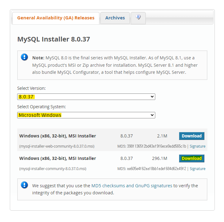 ๋๋ 8.0.37 ๋ฒ์ ์ Windows (x86, 32-bit), MSI Installer ๋ฅผ ์ ํํ๋ค.