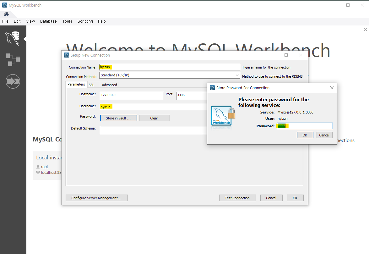 MySQL Workbench๋ฅผ ์คํํ ํ, root ๊ณ์ ์ ๋๋ฌ ์ ์ํ๋ค.