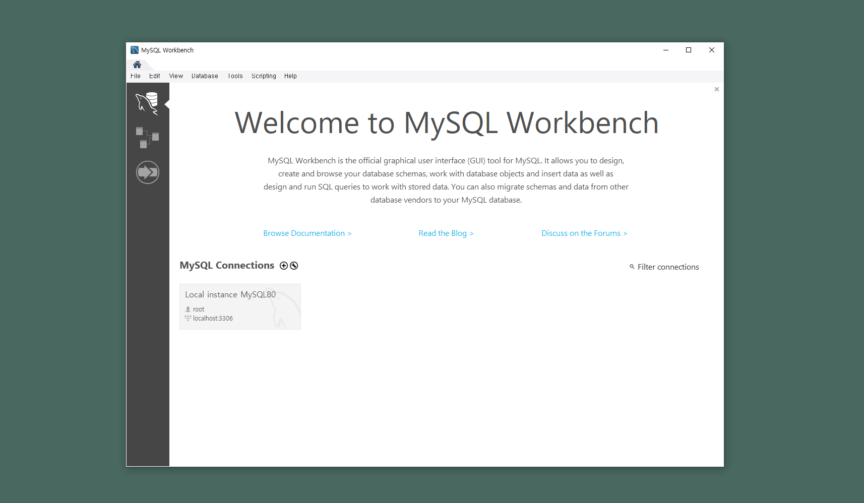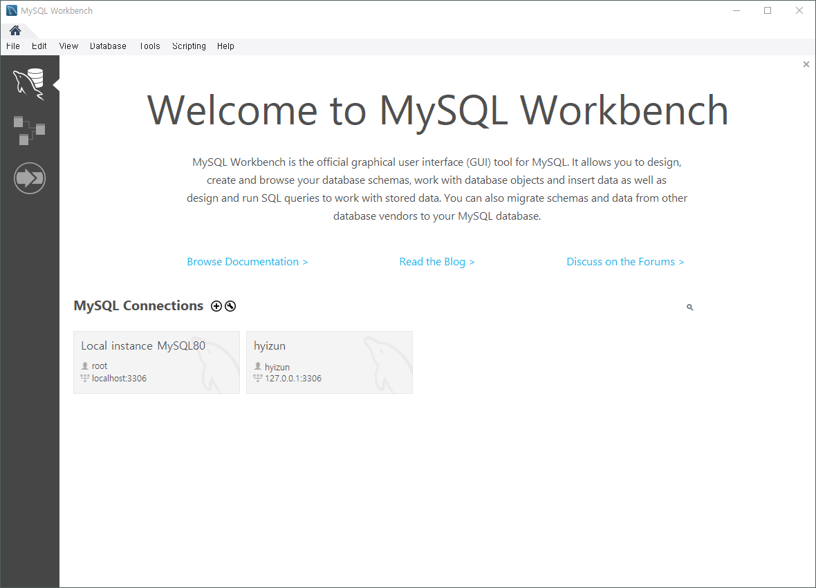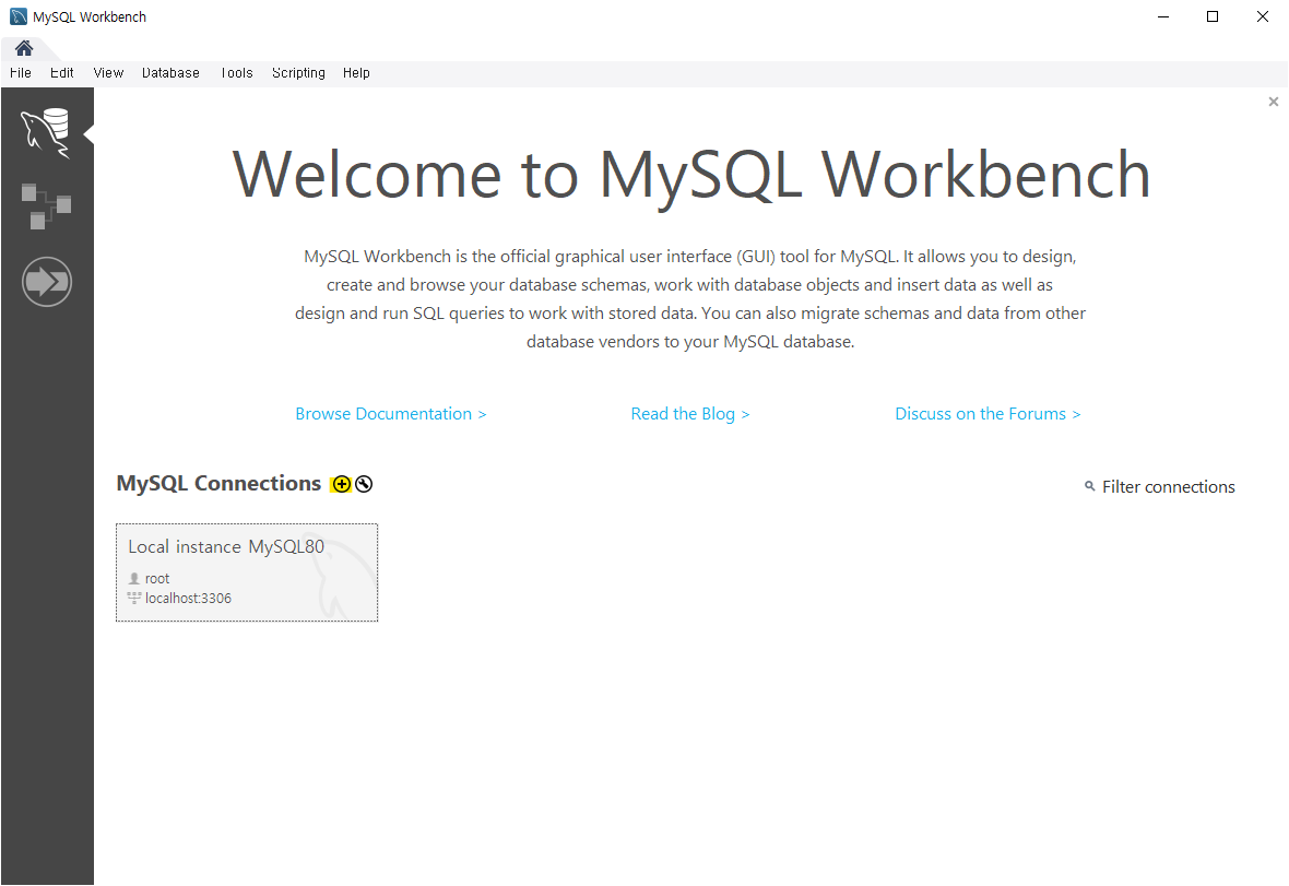 MySQL Workbench๊ฐ ์คํ๋์ด ๋์๋๋ ๊ฒ์ ํ์ธํ ์ ์๋ค.