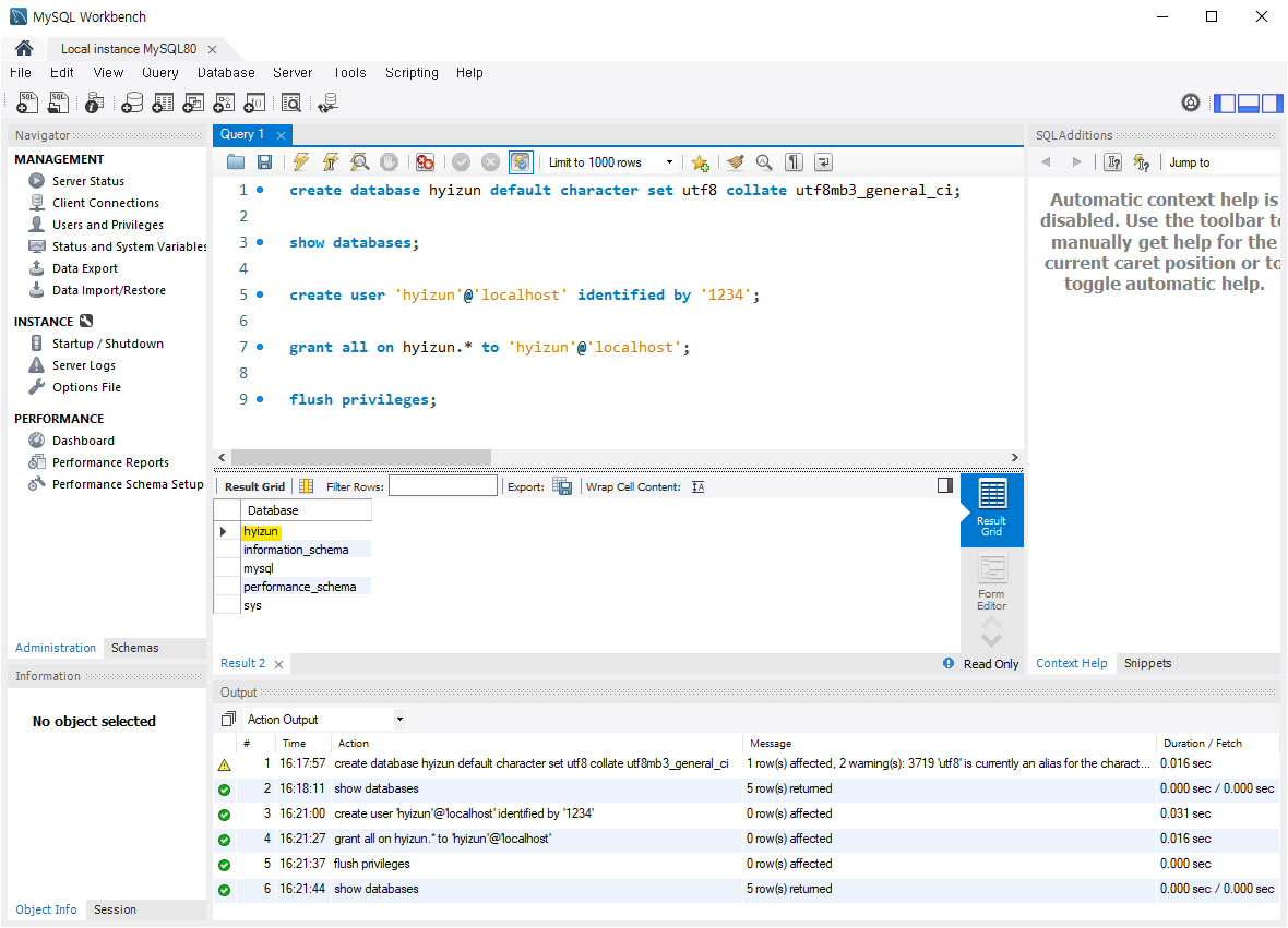 hyizun์ด๋ผ๋ ์ด๋ฆ์ ์ ๋ฐ์ดํฐ๋ฒ ์ด์ค๋ฅผ ์์ฑ
