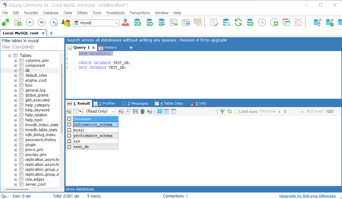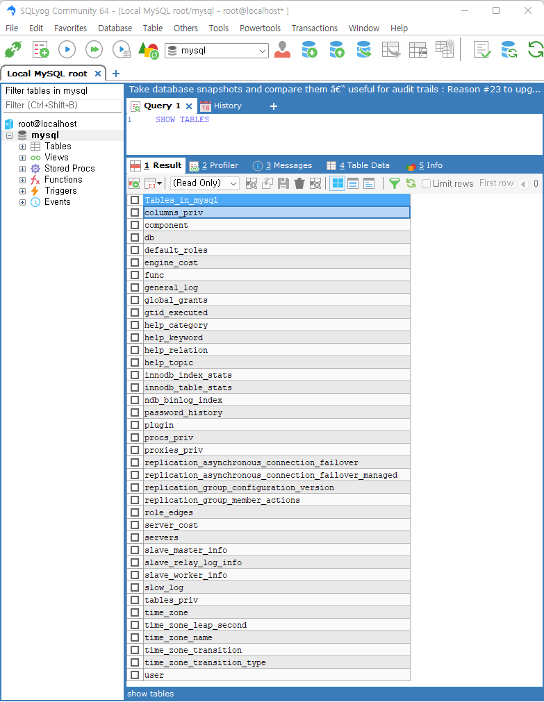 - MySQL은 기본적으로 "mysql"이라는 Database로 관리함