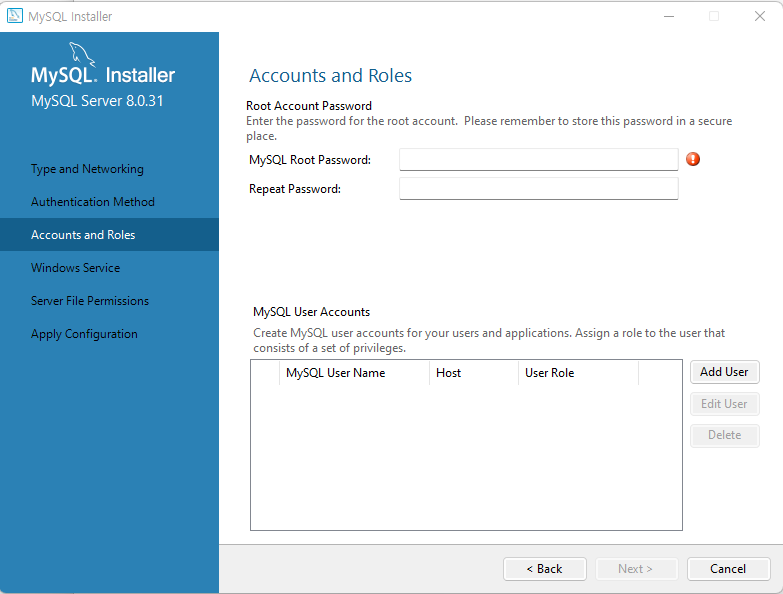 10) "Accounts and Roles" - MySQL Root Password 입력 (반드시 기억)