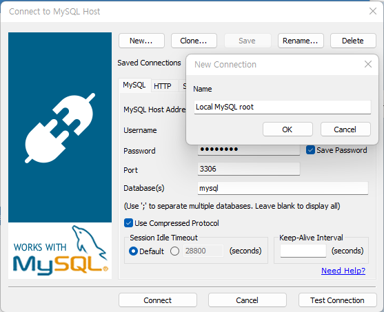 1) New 버튼 클릭 후 Name을 "Local MySQL root"로 입력