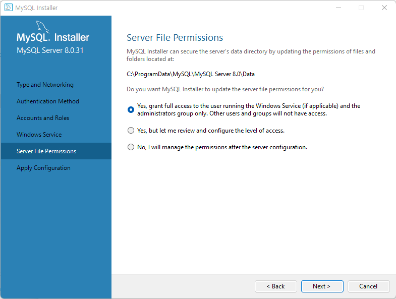 12) "Server File Permissions" (Default 선택) Next 클릭