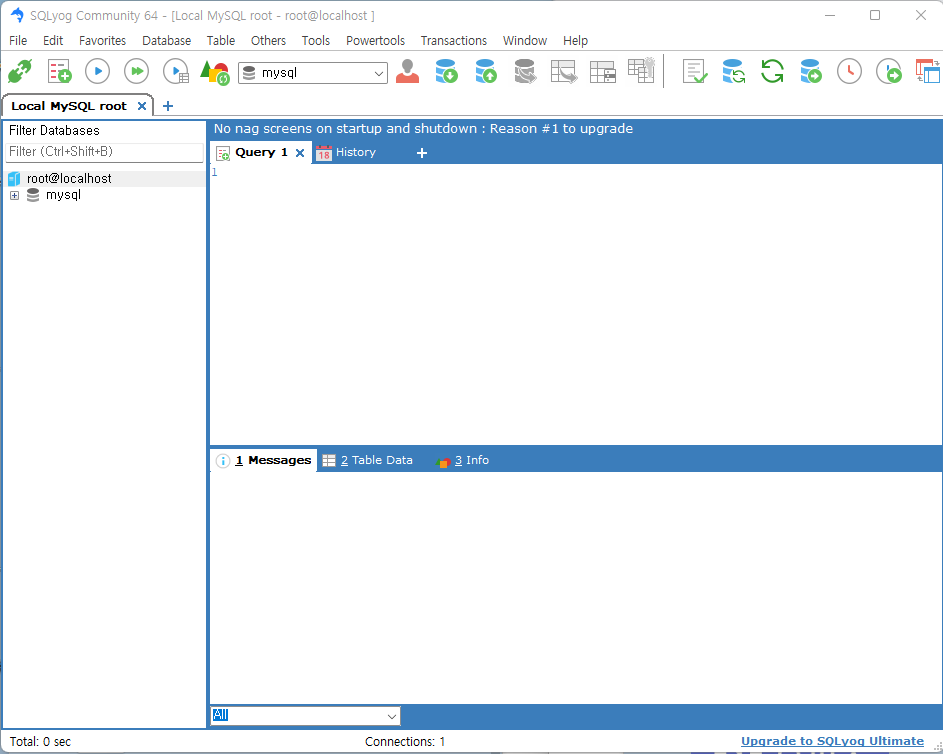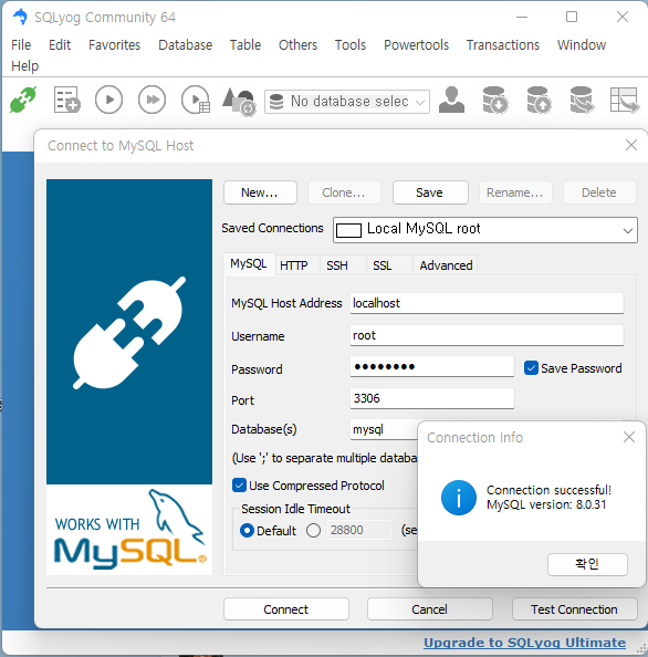 3) "Connect" 버튼 클릭 후 root 접속 성공 화면