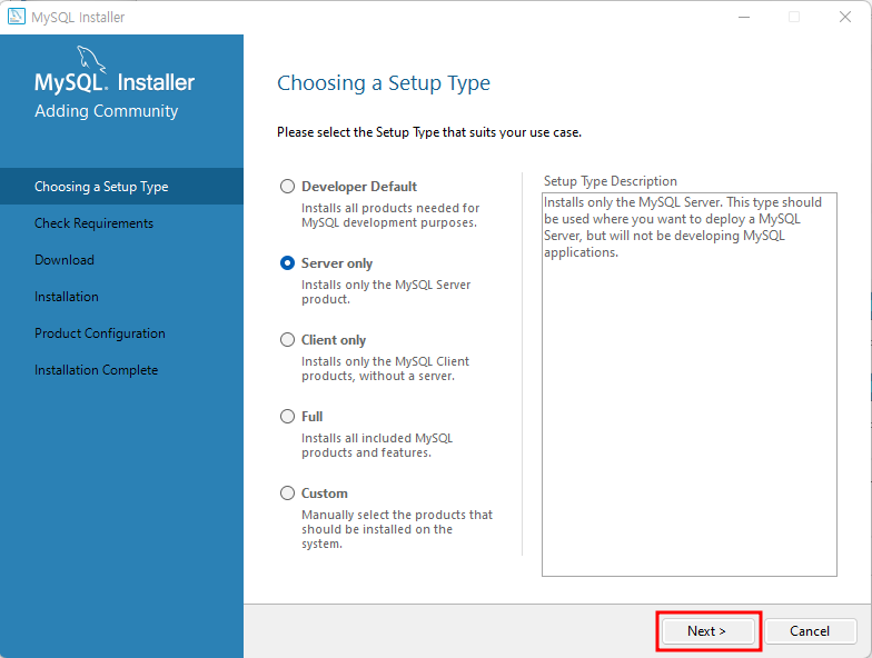 2) Choosing a Setup Type 화면에서 Server Only를 선택