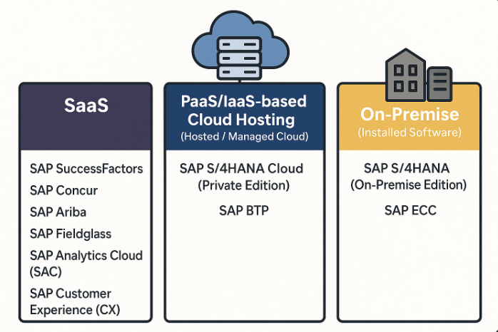 : These systems are built on the cloud (with servers located outside the company) but can be customized to meet specific organizational needs. SAP or a certified partner builds and manages the infrastructure, and the company accesses it as a service.