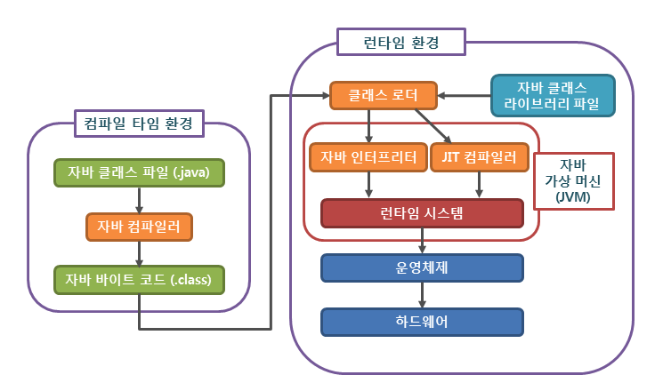 - JVM은 자바와 운영체제 사이에서 중계자의 역할을 하며, 자바가 운영체제의 종류(Linux, Mac, ...)에 관계없이 실행 가능하도록 한다.