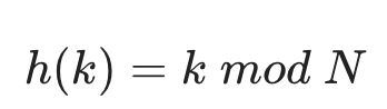 아주 간단하게 해시값을 구하는 방법으로 미리 해시 테이블의 크기인 N을 아는 경우에 사용할 수 있습니다. 해시함수를 적용하고자 하는 값을 N으로 나눈 나머지를 해시값으로 사용하는 방법입니다.
